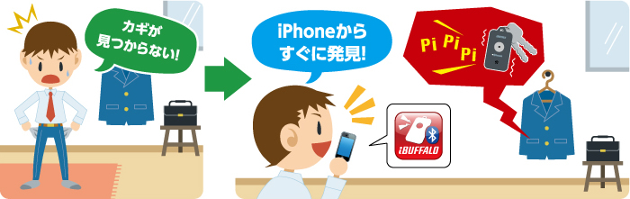 ・大切な物を探せる!!置き忘れを防ぐ!! ・キーホルダーが見当たらない時に、iPhone4Sからキーホルダーを振動、 またはブザーを鳴らせ、探すことができます。 ・iPhone4Sが見当たらない時に、iPhone4Sを振動、またはブザーを鳴らせ、 探すことができます。 ・キーホルダーとiPhone4Sが、指定した距離よりも離れると、キーホルダーも iPhone4Sも互いに振動して、持ち主に知らせます。本製品を家や車のカギ等につけておけば、カギが見当たらない時に、iPhone4Sからカギを探すこともできるようになります。